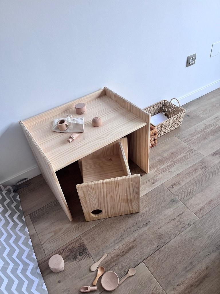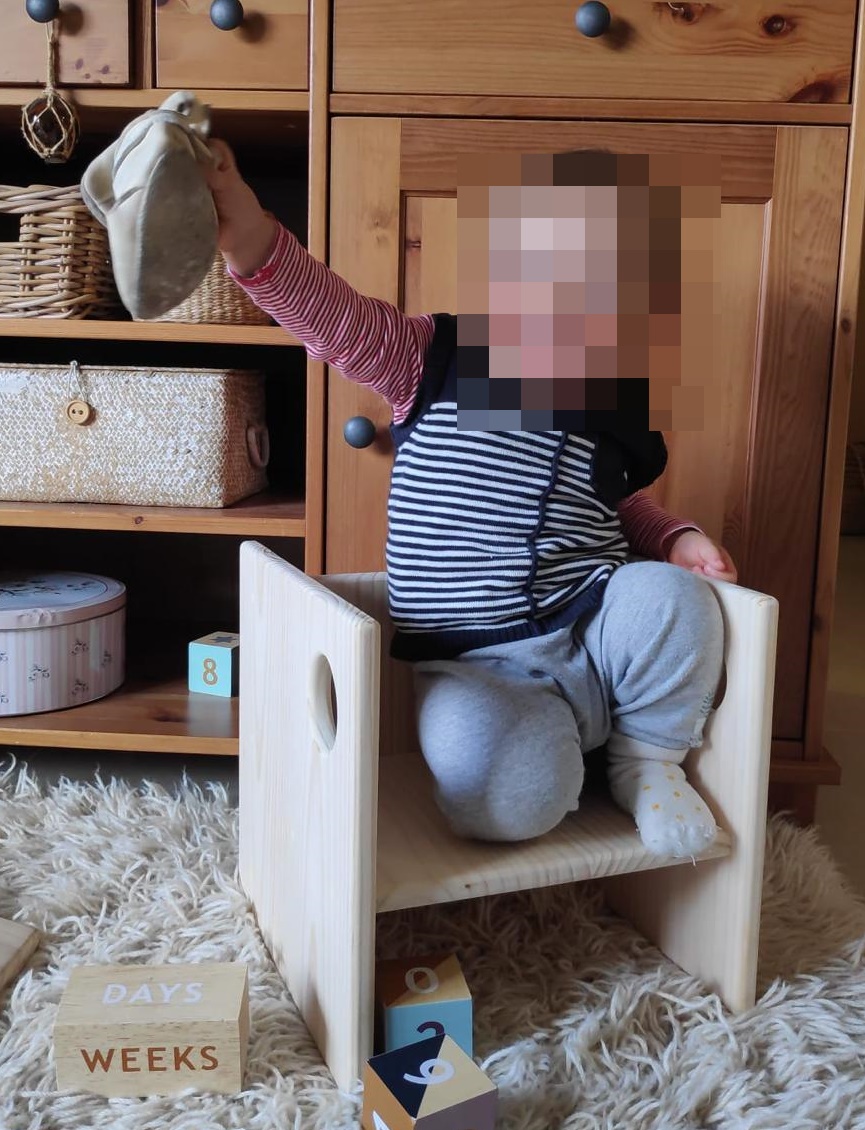 Permite al niñx ganar autonomía a la hora de sentarse, además al tener 3 posiciones, la silla se adapta al desarrollo y crecimiento del niñx. (ya que en cada posición la base para sentarse queda a una altura diferente) Los agujeros laterales facilitan su agarre y desplazamiento.