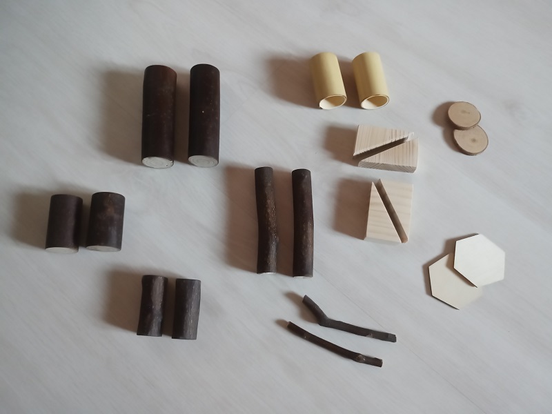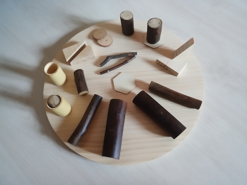 -Lote de troncos, con piezas de bambú, palos y otras de madera (18 piezas). Incluyen troncos de diferentes grosores y tamaños que permiten diferentes composiciones de juego, siempre manteniendo el contacto con elementos naturales.