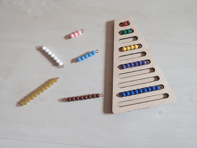 Conjunto de perlas Montessori que simbolizan los números de 1-10, permitiendo trabajar con ellos de manera muy manipulativa y asociar cada número con la cantidad a la que hace referencia.