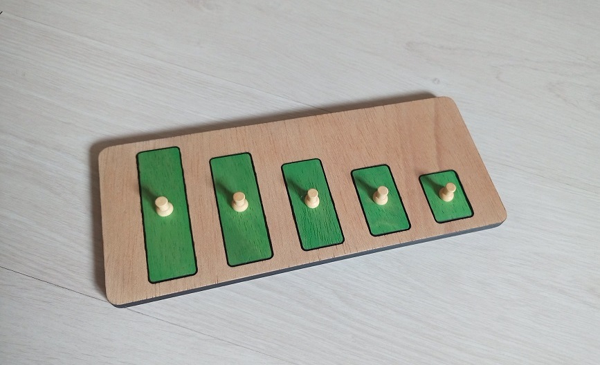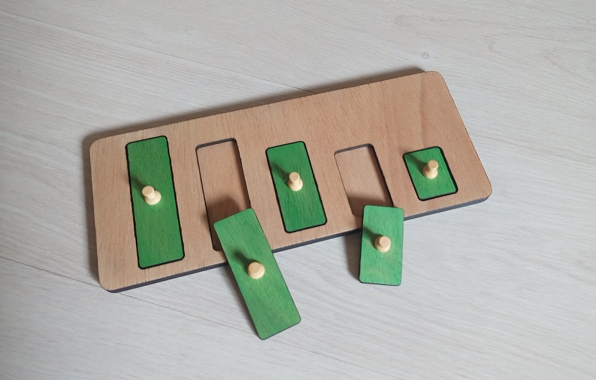 Puzles basados en los principios de los cilindros Montessori con botón, ya que se pretende trabajar la discriminación visual en base a una variante; en este caso la altura. Cada pieza tiene su pomo para facilitar el agarre de las mismas.