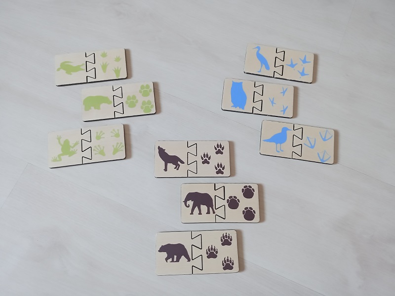 Las tarjetas de control incluyen la imagen real de cada animal con cada huella, ambas imágenes lo más reales y parecidas posibles a las siluetas del puzle, tanto en postura como en orientación, para que una vez hecho el puzle, el propio niñx pueda comprobar si emparejó cada uno con su huella. Las tarjetas de control tienen una línea de un color representativo para cada medio y los puzles de madera pueden ser en grabado o pintados cada uno del color de referencia que figura en las tarjetas.