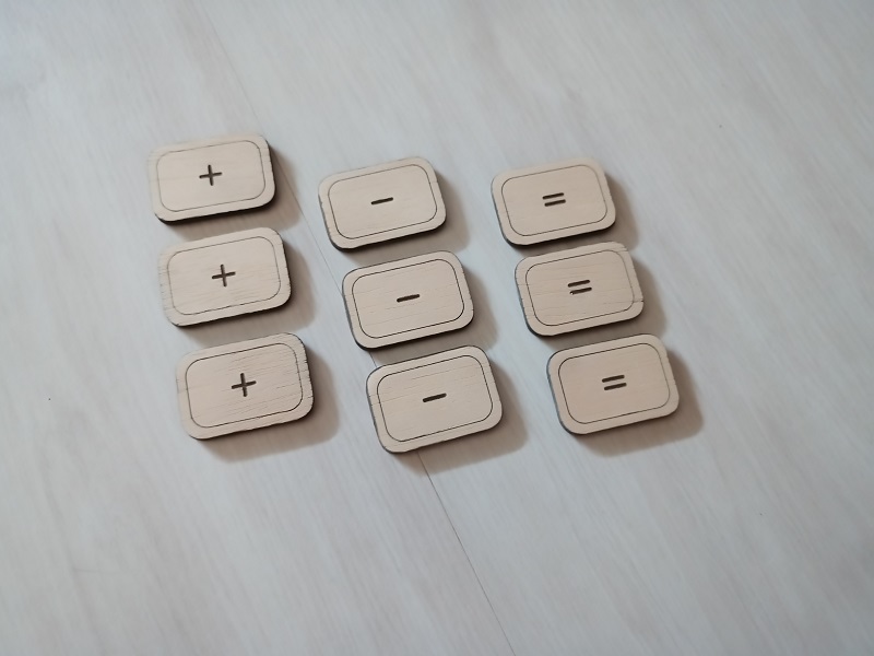 * Existe la opción de añadir unas tablillas de madera con los signos: +, – e = para realizar operaciones con las tarjetas (2€)