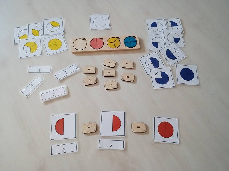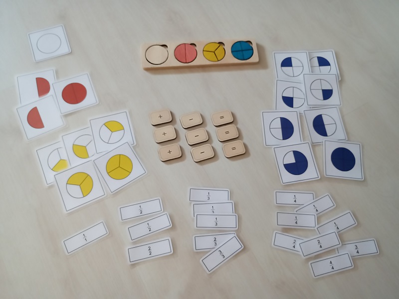 Basado en el material Montessori de los peones de fracciones, su uso es el mismo, permite trabajar el concepto de fracción de una manera muy visual, ya que se presenta un círculo entera que representa la unidad y otros 3 círculos divididos en partes iguales: 2 partes, 3 partes y 4 partes, cada círculo de un color para que visualmente forme la unidad, tanto en forma como color.